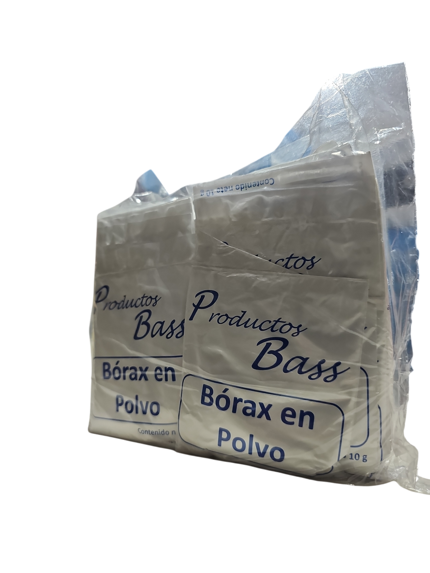 Bórax en polvo, presentado en paquete con 50 sobres individuales. Ideal para uso doméstico, limpieza y trabajos de laboratorio, ofreciendo facilidad de dosificación y almacenamiento. Su presentación en sobres asegura practicidad y control en cada aplicación.