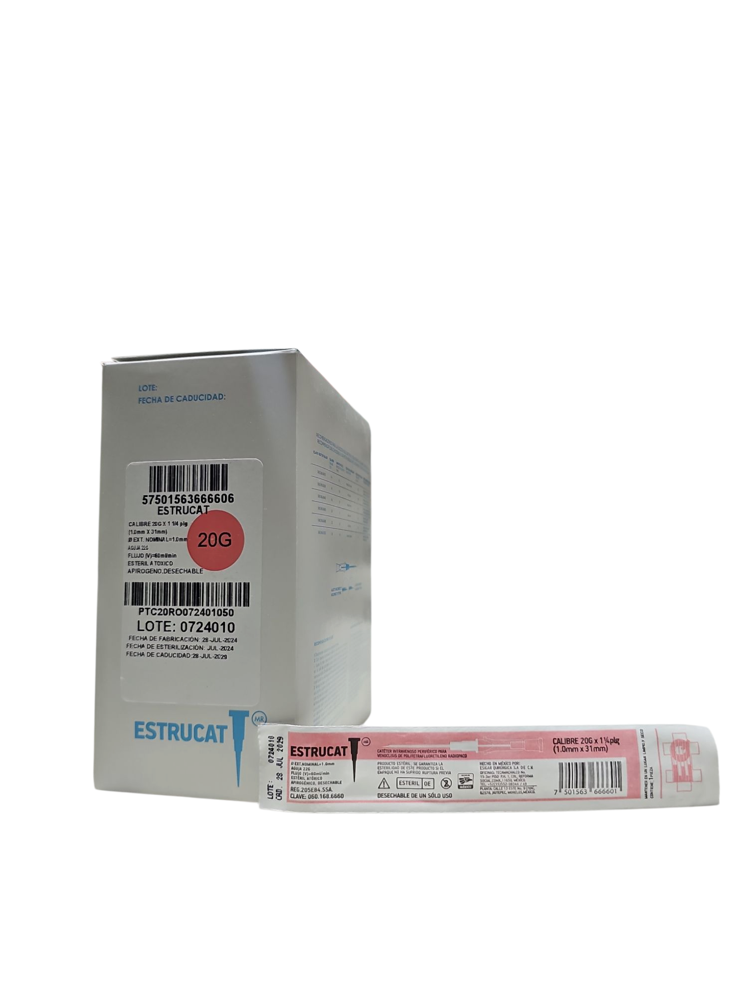 Catéter intravenoso periférico ESTRUCAT calibre 20, diseñado para procedimientos médicos que requieren una canalización eficiente y segura. Su color rosa permite identificar fácilmente el calibre, y su diseño transparente facilita la visualización del flujo sanguíneo.