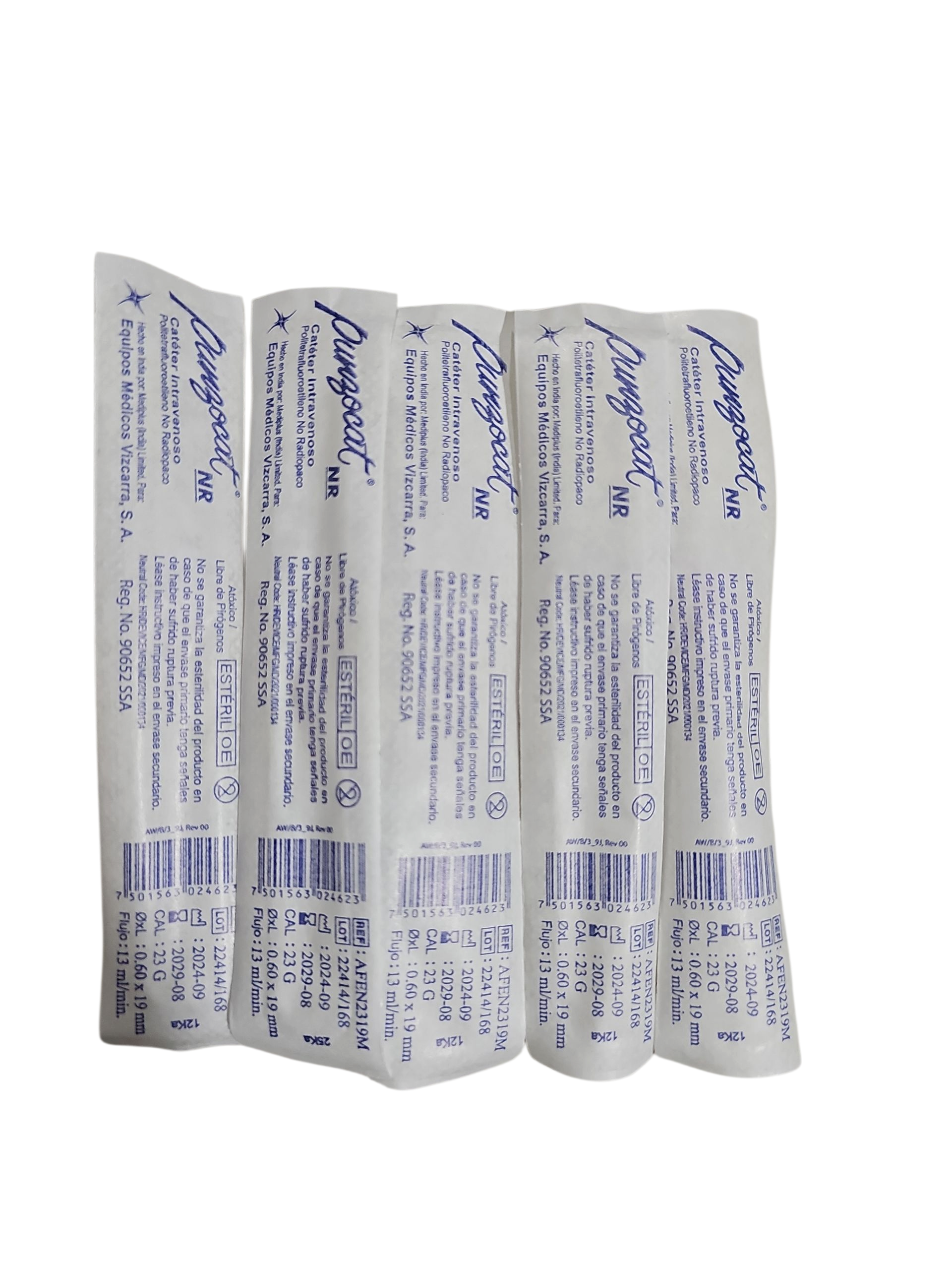 Catéter intravenoso calibre 23, color morado, de la marca Vizcarra. Producto estéril y de un solo uso, ideal para procedimientos médicos que requieren canalización venosa periférica con flujo preciso.