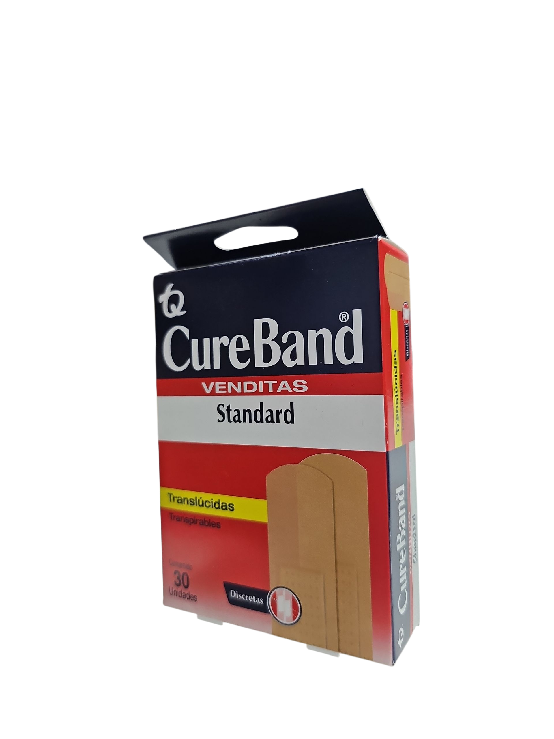 Curitas adhesivas translúcidas de la marca CUREBAND, ideales para proteger cortes, raspaduras y heridas menores. Su diseño discreto y flexible se adapta a la piel, permitiendo transpiración y ofreciendo una barrera efectiva contra suciedad y bacterias.