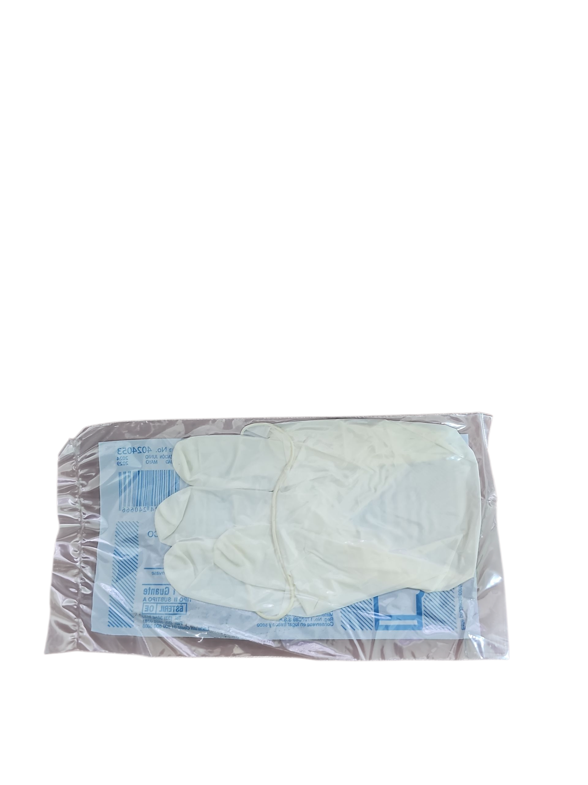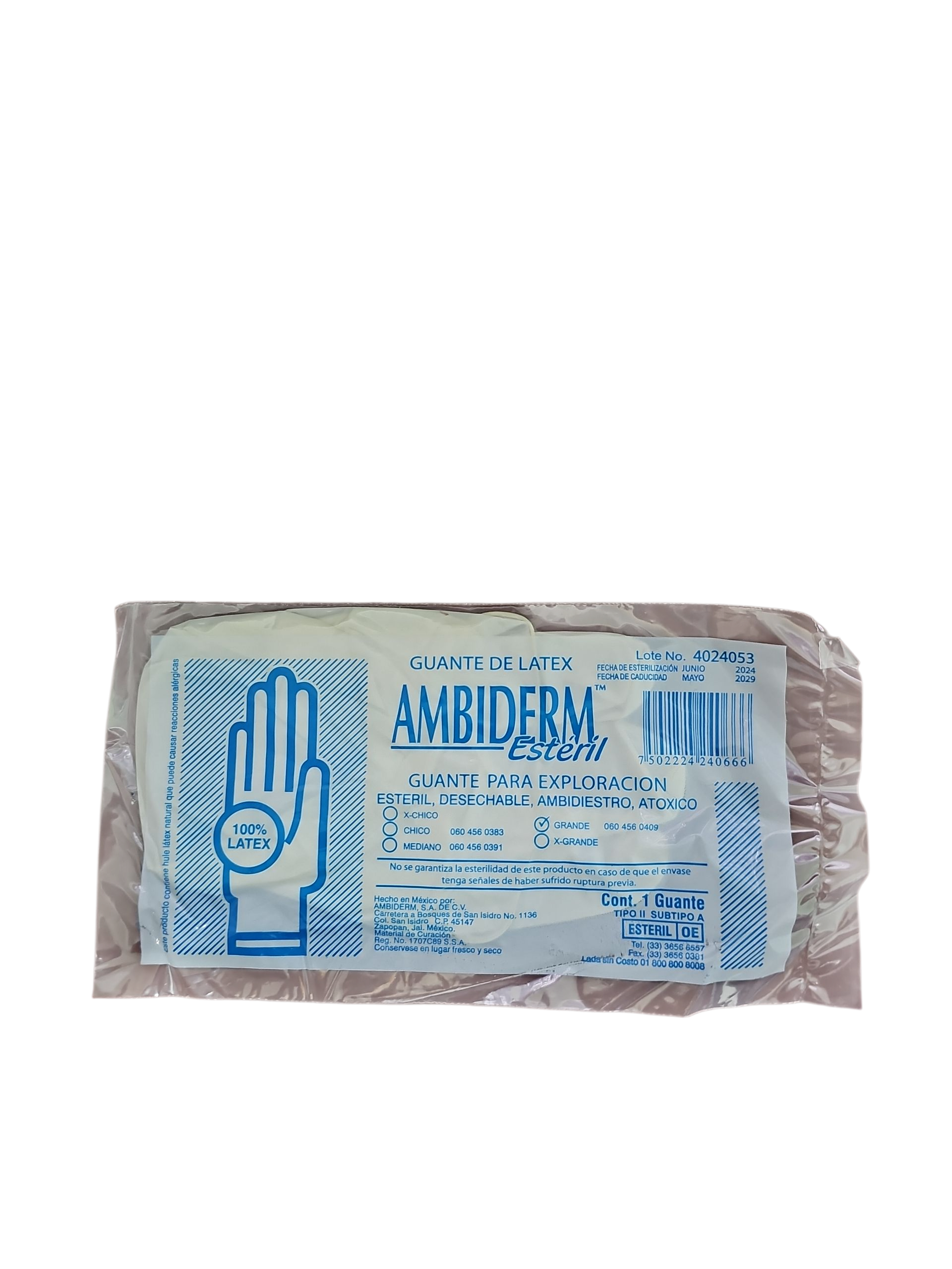 Guante de látex estéril de la marca Ambiderm, tamaño grande. Ideal para procedimientos médicos y quirúrgicos que requieren máxima higiene y protección, ofreciendo ajuste seguro, comodidad y seguridad durante su uso.