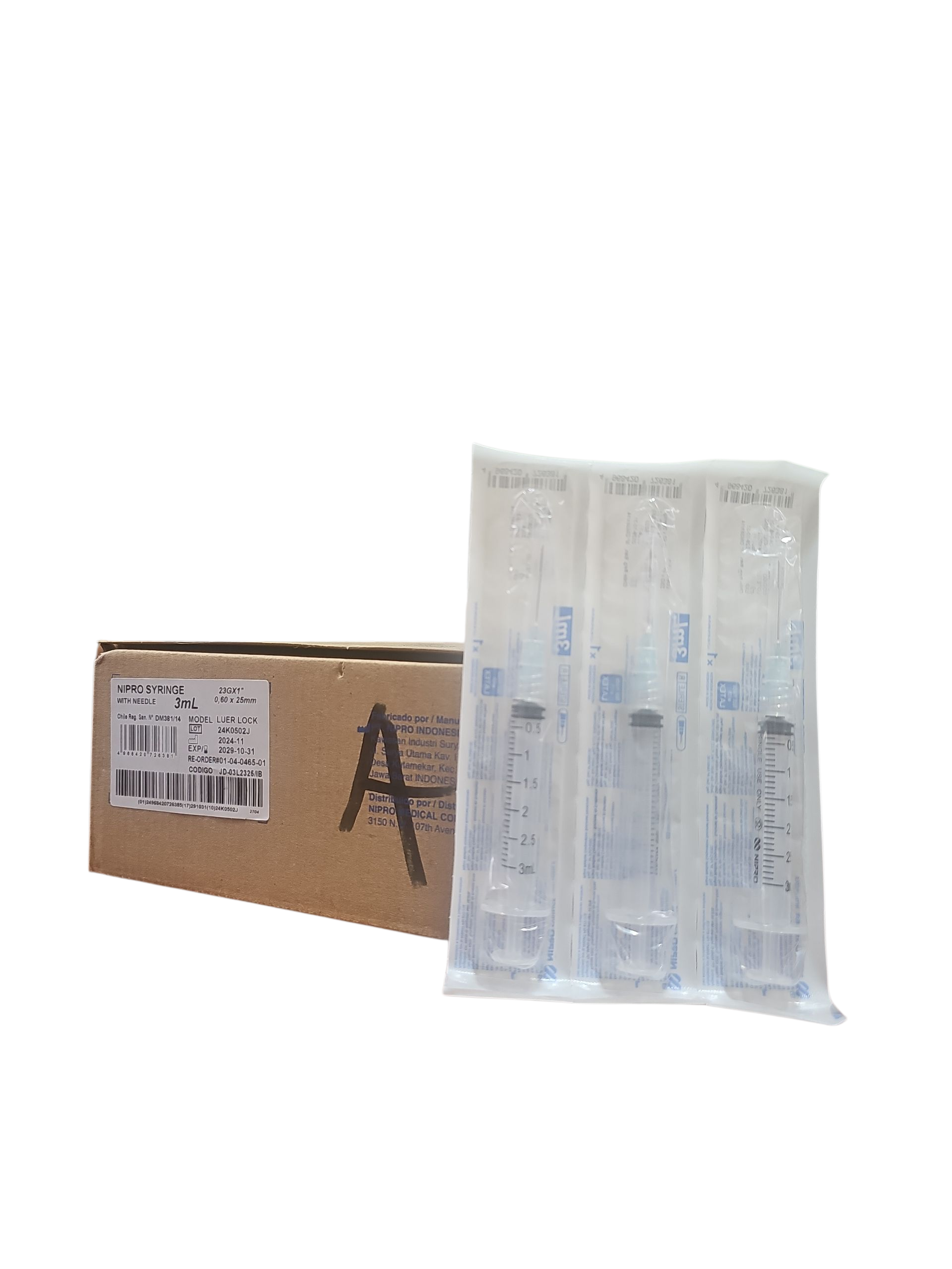 Jeringa NIPRO de 3 ml con aguja identificada en color azul, diseñada para aplicaciones médicas de precisión. Fabricada con materiales de alta calidad, garantiza suavidad en el deslizamiento del émbolo, exactitud en la dosificación y seguridad en cada uso.