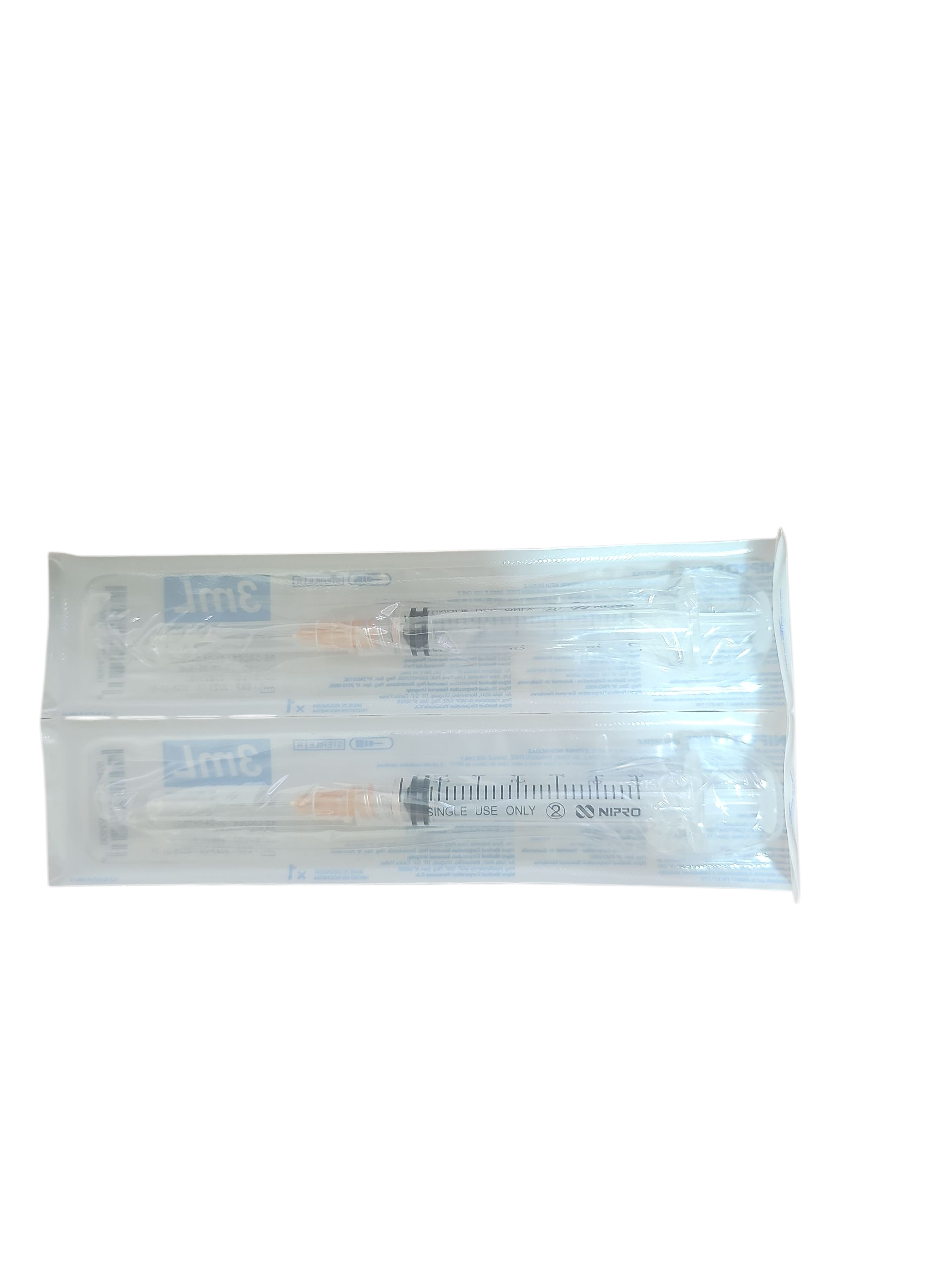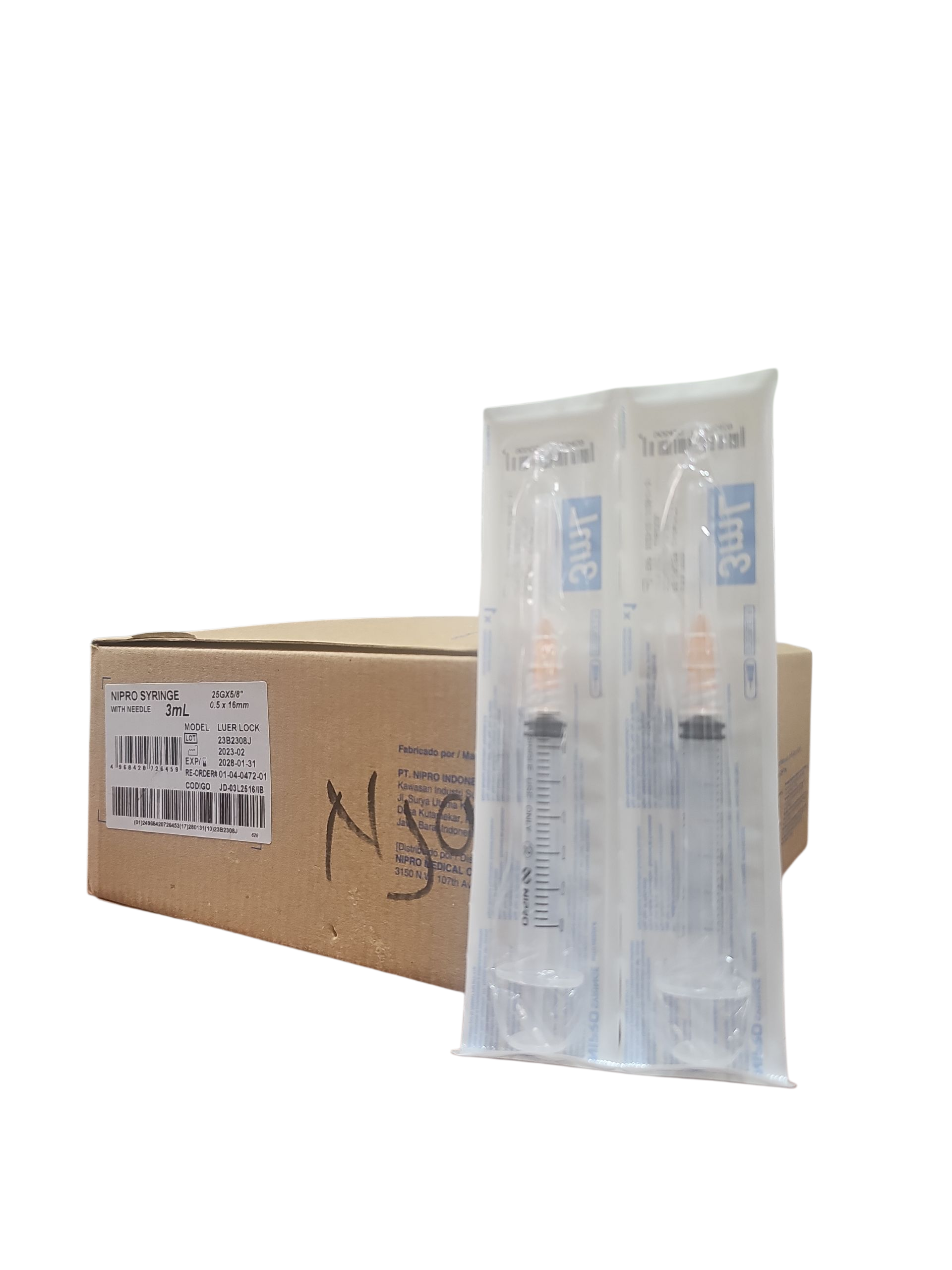 Jeringa NIPRO de 3 ml con aguja color naranja, diseñada para aplicaciones médicas de precisión. Fabricada con materiales de alta calidad, garantiza suavidad en el deslizamiento del émbolo, exactitud en la dosificación y seguridad en cada uso.