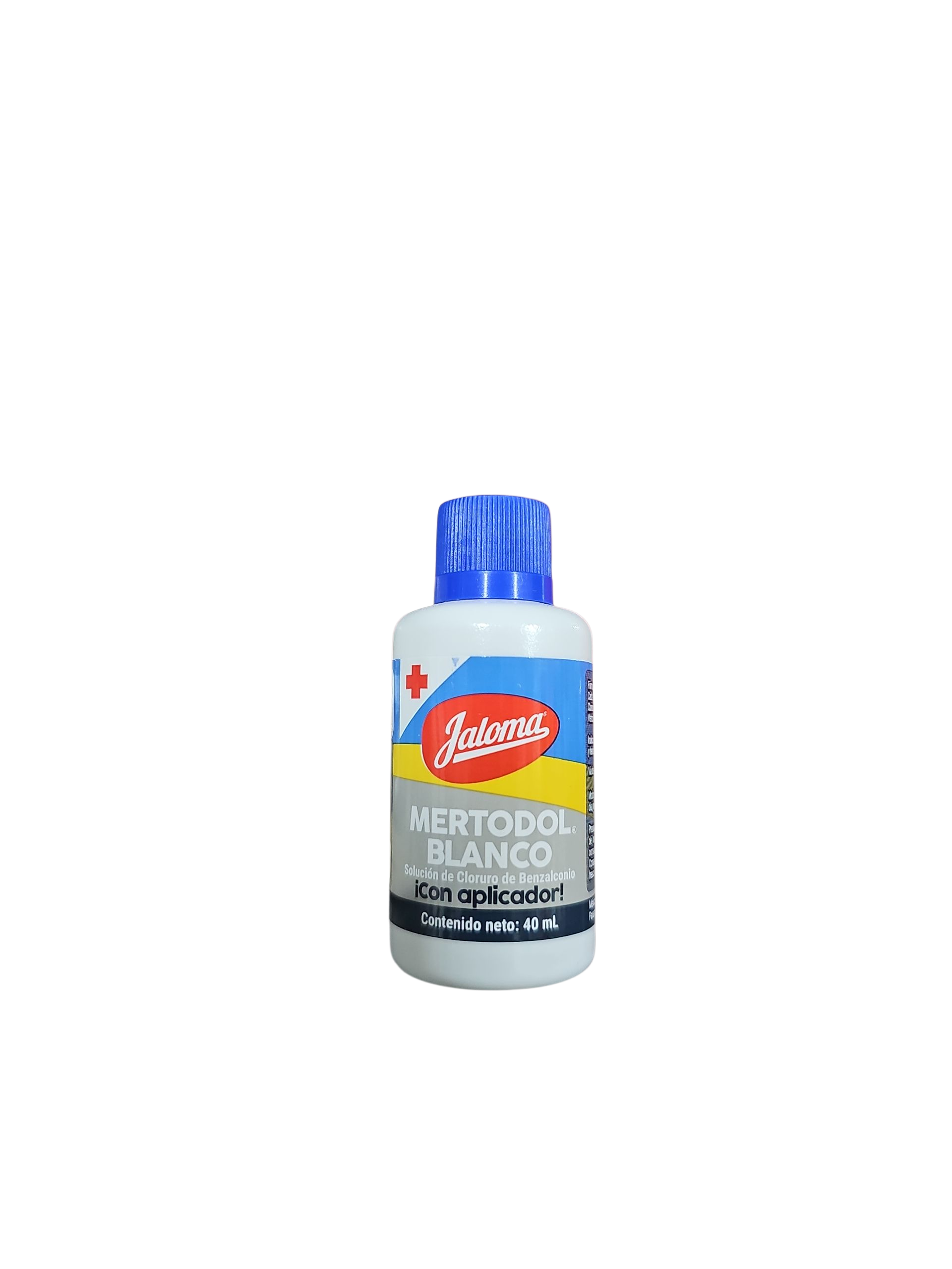 El Mertodol Blanco Jaloma es un antiséptico tópico ideal para la desinfección de pequeñas heridas, raspones, cortaduras leves y quemaduras superficiales. Su fórmula con cloruro de benzalconio al 0.13 % ayuda a prevenir infecciones y favorece una adecuada cicatrización.