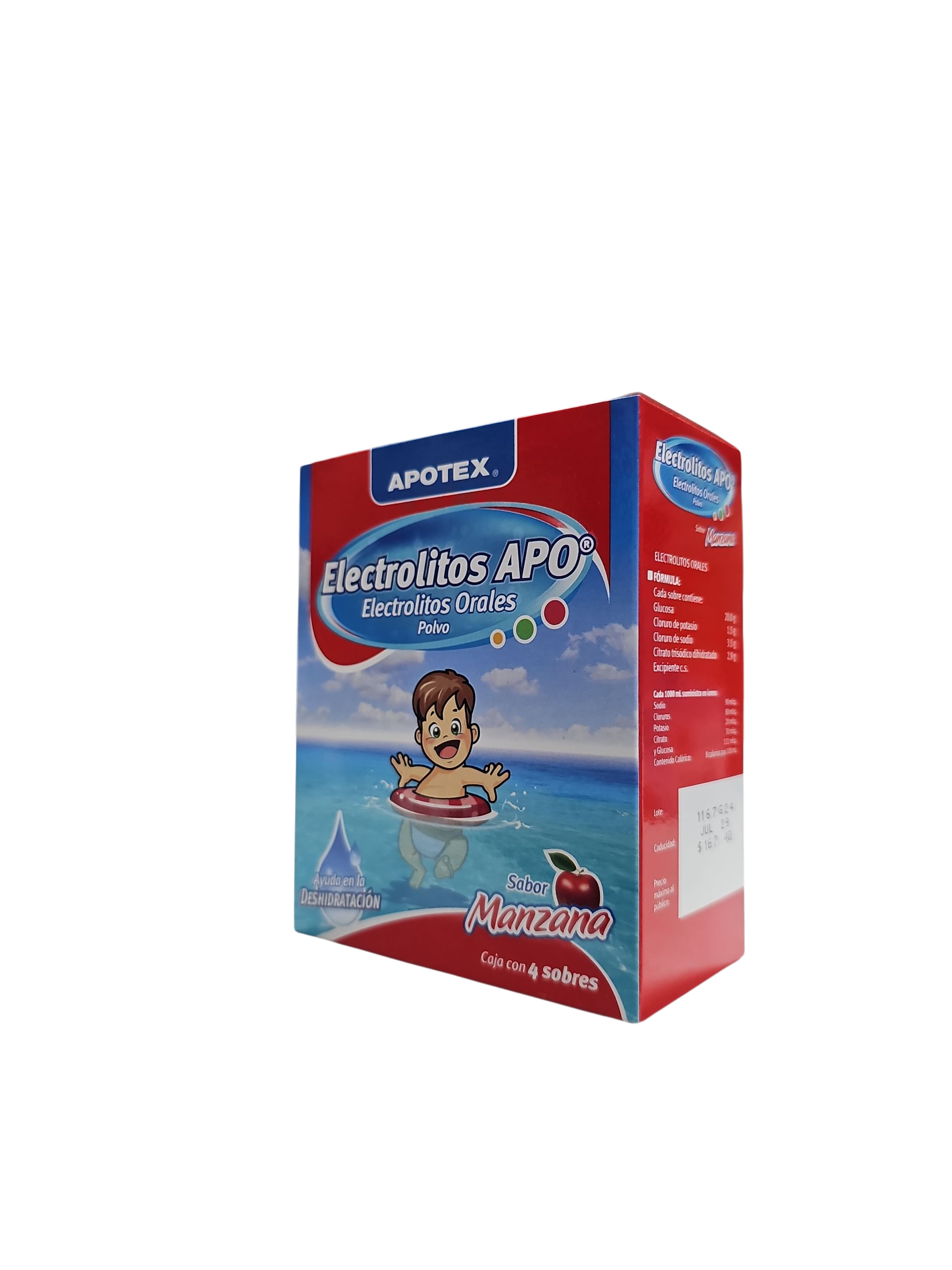 El suero ELECTROLITOS APO sabor manzana es una solución oral de rehidratación diseñada para reponer líquidos y electrolitos perdidos durante la actividad física, exposición al calor o deshidratación leve. Cada sobre contiene 4 unidades, facilitando su preparación y administración rápida, ya sea en casa, escuela o actividades al aire libre.