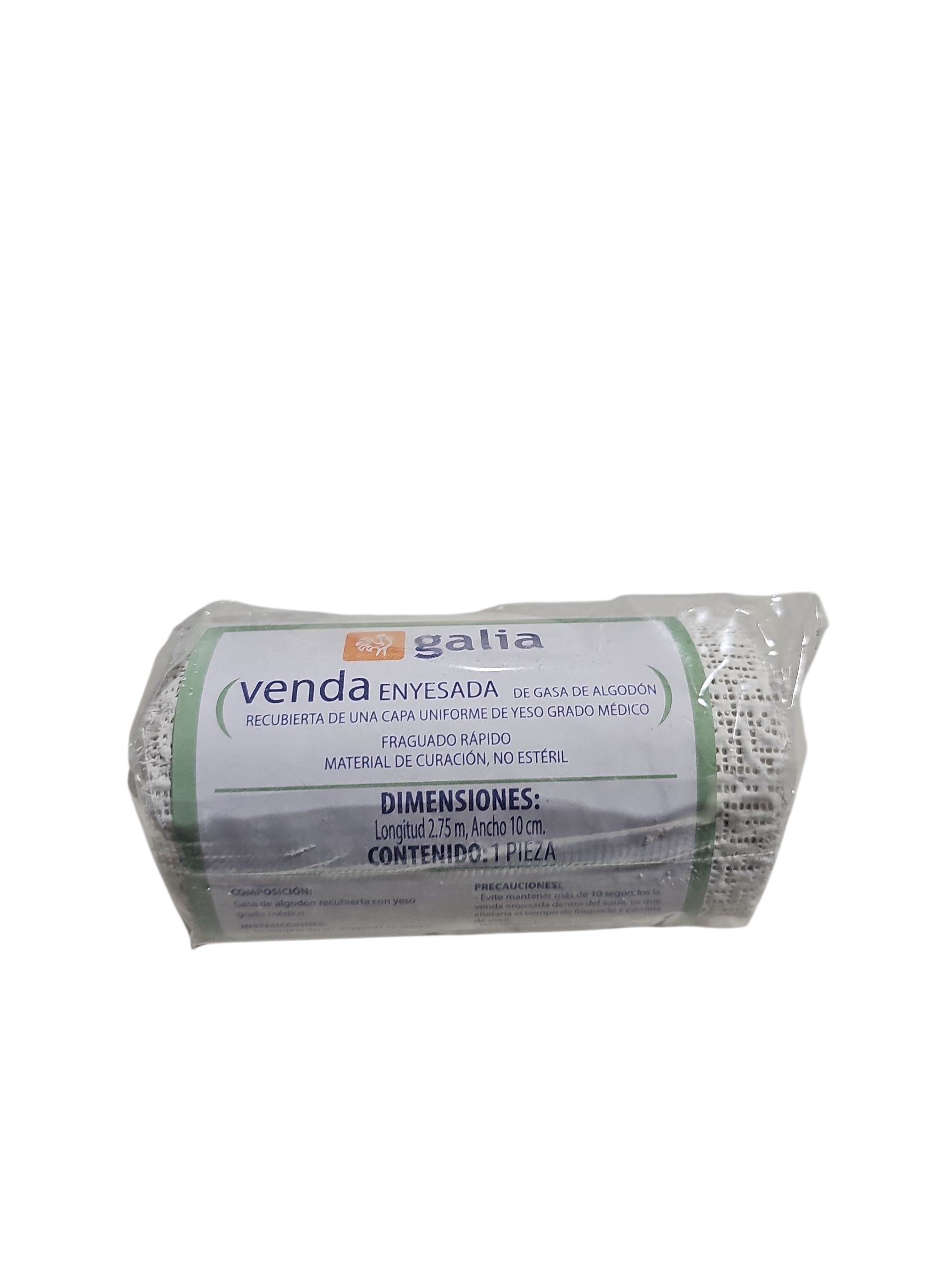 Venda de Yeso 10cm marca GALIA, diseñada para la inmovilización y soporte en tratamientos ortopédicos. Su material de alta calidad asegura un fraguado rápido y resistente, ofreciendo firmeza y estabilidad a la zona lesionada. Es práctica, fácil de moldear y garantiza una adecuada protección durante la recuperación.